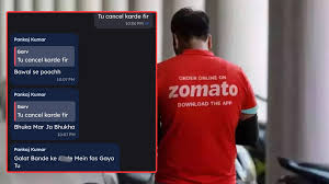 गर्व नाम के कस्टमर के स्टीकर वाले मैसेज पर रिप्लाई करते हुए डिलीवरी बॉय पंकज लिखता है कि ‘भाई मैं नहीं आ रहा, मेरा मन नहीं कर रहा, ऑर्डर कैंसिल कर दे, भूखा रह तू, भूखा मर।’ इसके रिप्लाई में कस्टमर उसे ऑर्डर कैंसिल करने को कहता है, तो वह कहता है कि ‘भूखा मर जा भूखा, गलत बंदे के चक्कर में फंस गया, मैं तो शराब पी रहा हूं।’