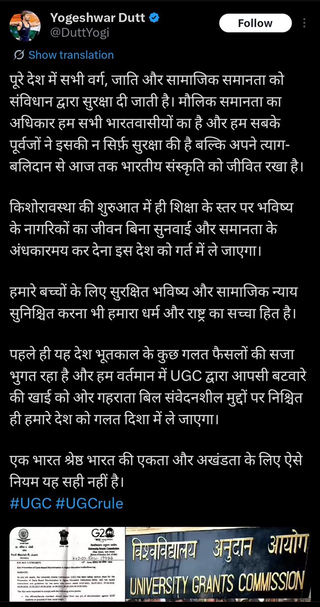 ओलंपिक पदक विजेता मुक्केबाज विजेंद्र सिंह ने सोशल मीडिया प्लेटफॉर्म एक्स पर एक पोस्ट के जरिए यूजीसी के नए ‘प्रमोशन ऑफ इक्विटी इन हायर एजुकेशन इंस्टीट्यूशंस रेगुलेशंस, 2026’ पर तीखा विरोध जताया है। विजेंद्र ने लिखा है कि शिक्षा समान अवसर प्रदान करने का माध्यम है, न कि जातिगत विभाजन का।