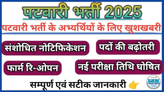 Patwari Jobs 2025: राजस्थान कर्मचारी चयन बोर्ड (RSMSSB) ने पटवारी भर्ती 2025 को लेकर बड़ा फैसला लिया है. पहले जहां इस भर्ती में 2020 पदों पर नियुक्ति होनी थी, अब इसे बढ़ाकर 3705 पद कर दिया गया है. इसके साथ ही आवेदन प्रक्रिया दोबारा शुरू करने का ऐलान भी किया गया है.