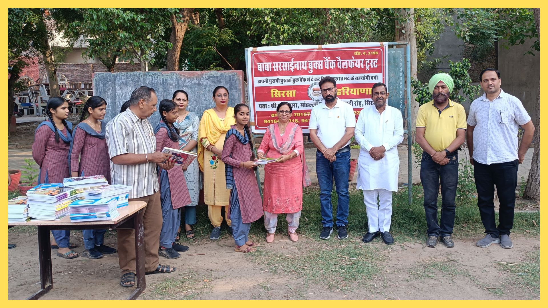 जानकारी देते हुए बताया कि कोई भी जरूरतमंद छात्र संस्था से पुस्तक प्राप्त कर सकता है, हमारी केवल एक ही शर्त रहती है कि छात्र पिछली कक्षा में 65 प्रतिशत से अधिक अंक प्राप्त करे। संस्था इसके साथ-साथ आंखों की नि:शुल्क जांच के लिए भी सेवाएं प्रदान करती है। विद्यालय के स्टाफ सदस्यों ने संस्था की कार्यकारिणी का आभार व्यक्त किया। विद्यालय की प्राचार्या संतोष रानी ने बुक बैंक के कार्यों की सराहना करते हुए कहा कि बुक बैंक सिरसा के छात्रों के लिए वरदान साबित हो रहा है। कार्यक्रम में मंच संचालन प्रवक्ता राजेश जैन द्वारा किया गया।